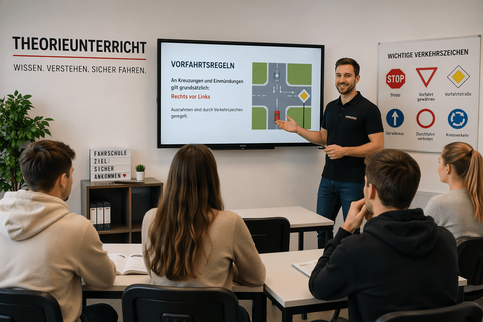 Im Theorieunterricht lernst du alle Inhalte, die für die Klasse B und die theoretische Prüfung wichtig sind. Wir erklären die Themen verständlich, praxisnah und so, dass du sie wirklich nachvollziehen kannst – nicht nur auswendig lernst. Fragen sind jederzeit willkommen.